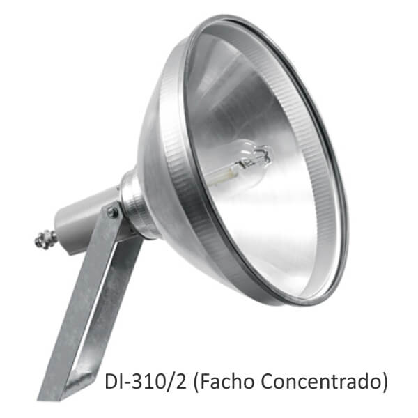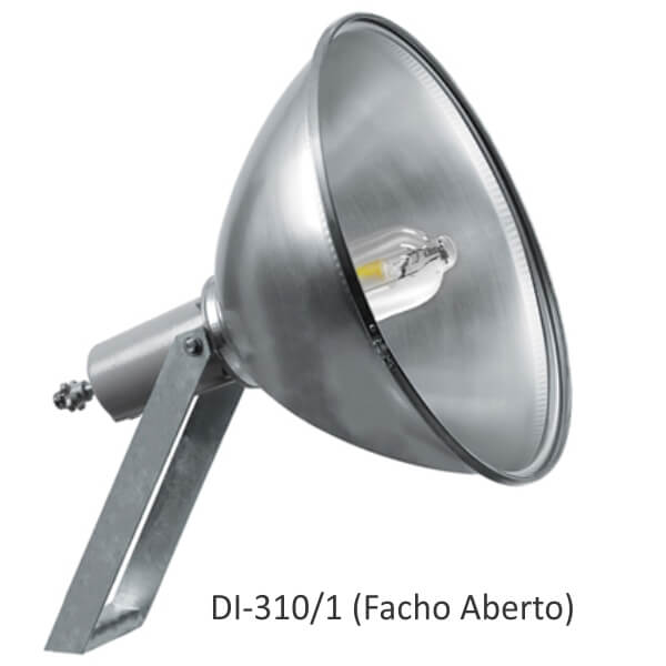 Projetor fechado simétrico de longo alcance, sem alojamento para equipamento auxiliar indicado para instalações em alturas elevadas, aplicações em grandes áreas, tais como: campo de futebol, fachadas, outdoors, monumentos, praias, pátios, estacionamentos, etc. Possui duas versões, DI-310/1 (facho aberto) ou DI-310/2 (facho concentrado). Possui soqueteira e focalizador para ajuste adequado de foco da lâmpada.